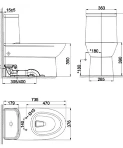 - Tâm xả: 305mm