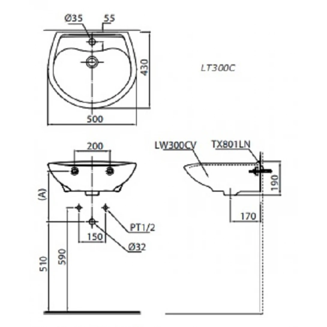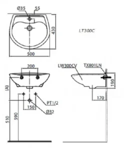 Bản vẽ chậu rửa mặt lavabo TOTO LT300 C